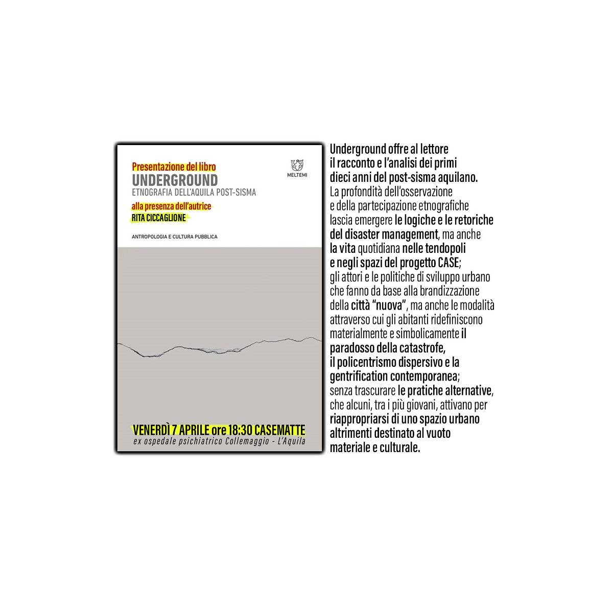𝗩𝗲𝗻𝗲𝗿𝗱𝗶̀ 𝟳 𝗮𝗽𝗿𝗶𝗹𝗲 𝗱𝗮𝗹𝗹𝗲 𝗼𝗿𝗲 𝟭𝟴:𝟯𝟬 CaseMatte ospiterà la presentazione del volume “𝗨𝗻𝗱𝗲𝗿𝗴𝗿𝗼𝘂𝗻𝗱. 𝗘𝘁𝗻𝗼𝗴𝗿𝗮𝗳𝗶𝗮 𝗱𝗲𝗹𝗹’𝗔𝗾𝘂𝗶𝗹𝗮 𝗽𝗼𝘀𝘁-𝘀𝗶𝘀𝗺𝗮” alla presenza dell’autrice 𝗥𝗶𝘁𝗮 𝗖𝗶𝗰𝗰𝗮𝗴𝗹𝗶𝗼𝗻𝗲.